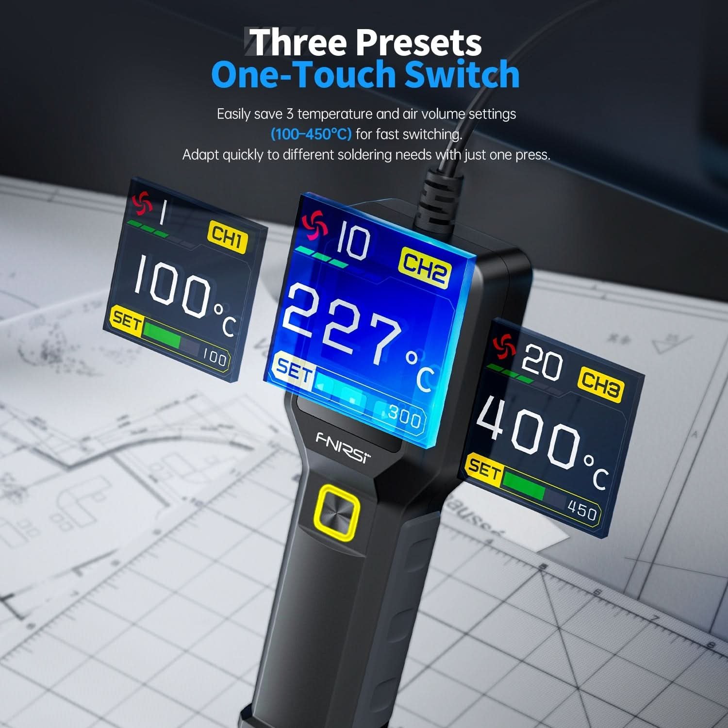Easily save 3 temperature and air volume settings (100-450℃) for fast switching. Adapt quickly to different soldering needs with just one press
